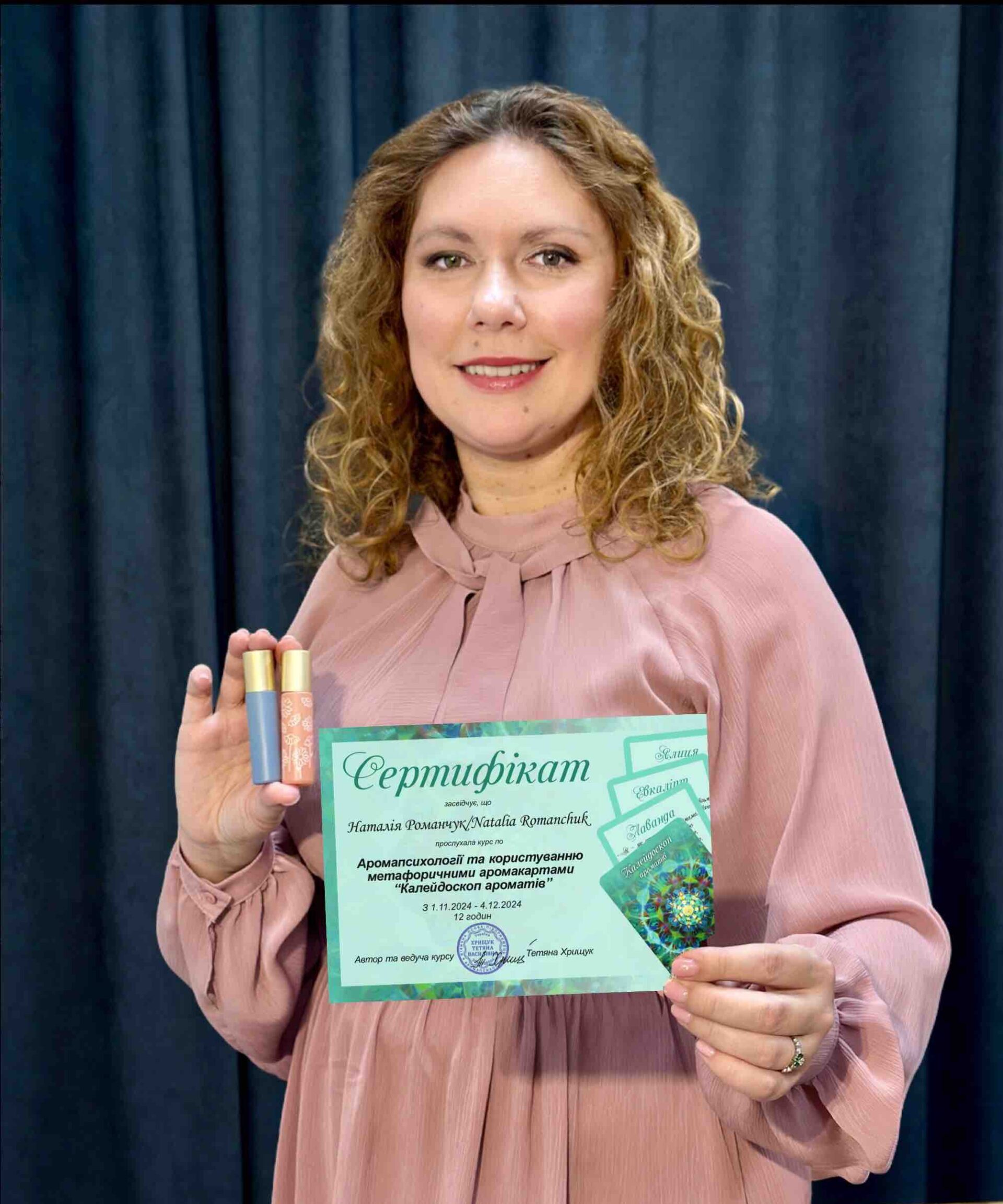 Прослухавши цей курс, я отримала цінні знання та навчилася працювати з аромокартами, що допомагають глибше розуміти запити клієнтів і знаходити відповідні аромати для їхнього стану.