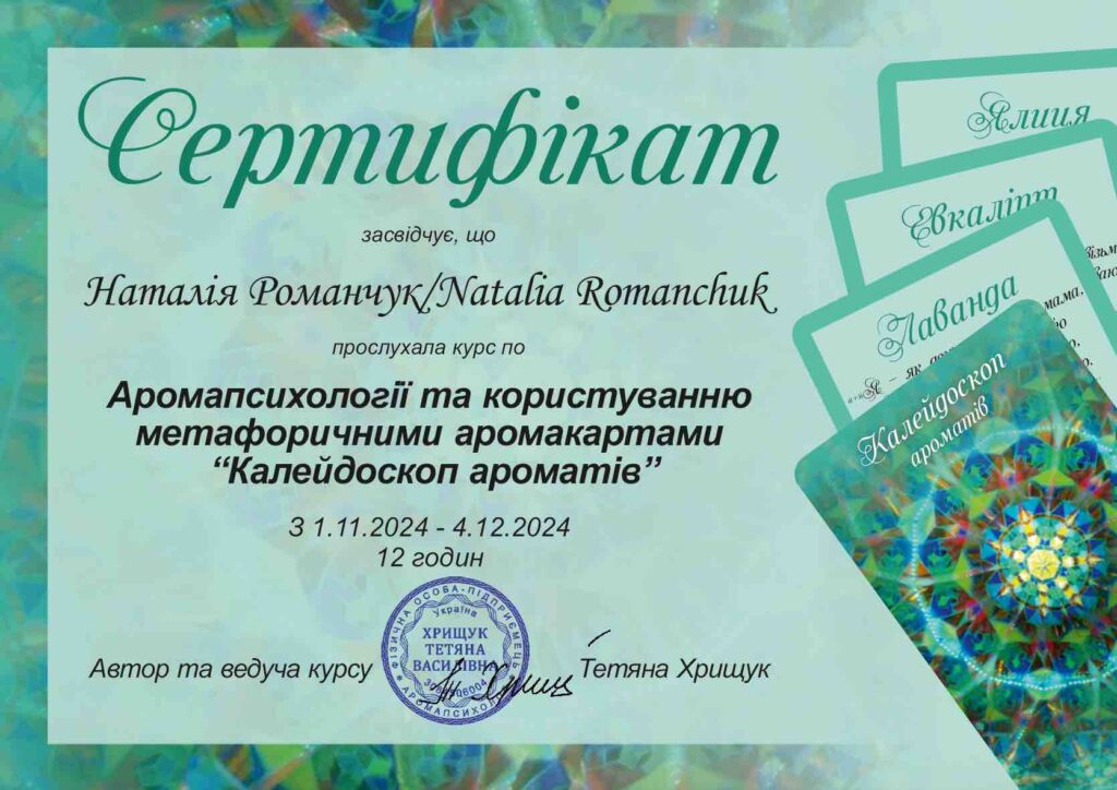 Я щиро вдячна Тетяні Хрищук за чудовий курс з аромопсихології та користування метафоричними аромокартами «Калейдоскоп ароматів».